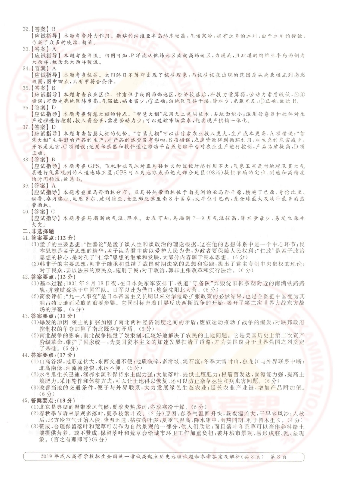 2019年浙江成考高起点历史地理(文综)考试真题及答案